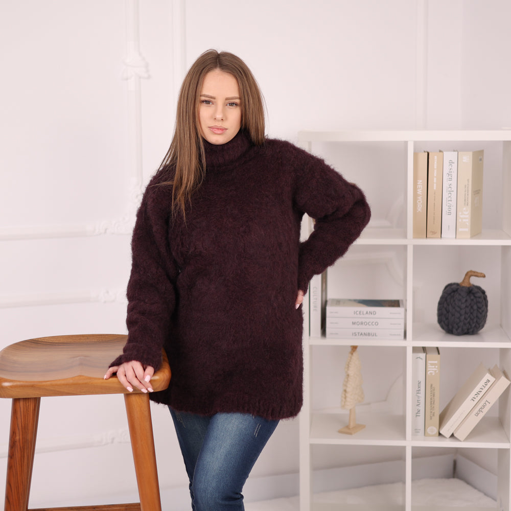 Soft Alpaca Sweater, Oversized Turtleneck Knit, Burgundy Long Pullover T2172