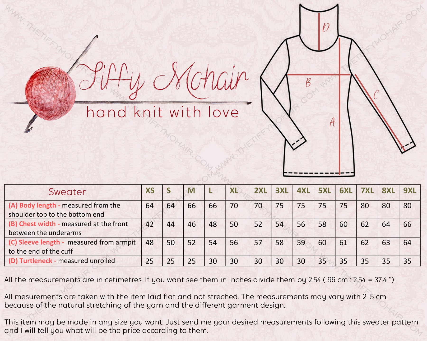 • Please keep in mind that measurements may differ by 2–5 cm because of the natural stretch of the yarn and the construction of the garment. Pieces made with more elastic yarns may vary by 2–10 cm.