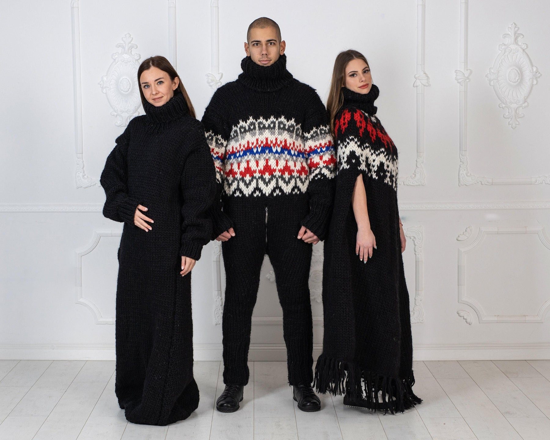 This black wool sweater dress is hand knitted from thick, soft wool for a warm and structured feel. The tall turtleneck and long, heavy silhouette give it a timeless, elegant look. A handmade maxi dress that blends cozy comfort with classic chunky knitwear style — perfect for winter days.