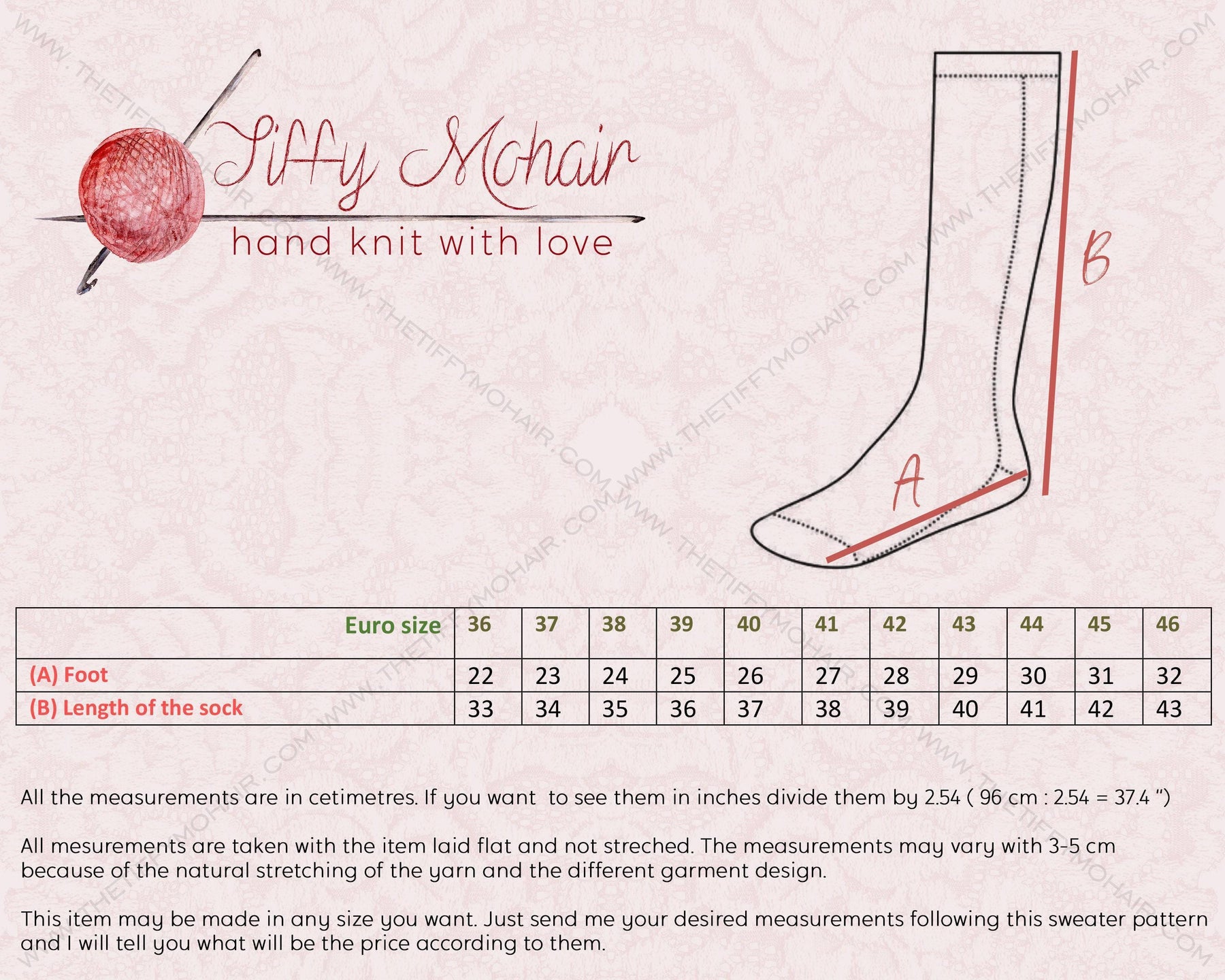 Hand-knitted from soft brushed mohair, these socks have a thick, airy texture that feels warm and gentle on the skin. They can be worn as cozy winter socks or fuzzy legwarmers, offering handmade comfort, natural insulation, and a luxuriously fluffy look.